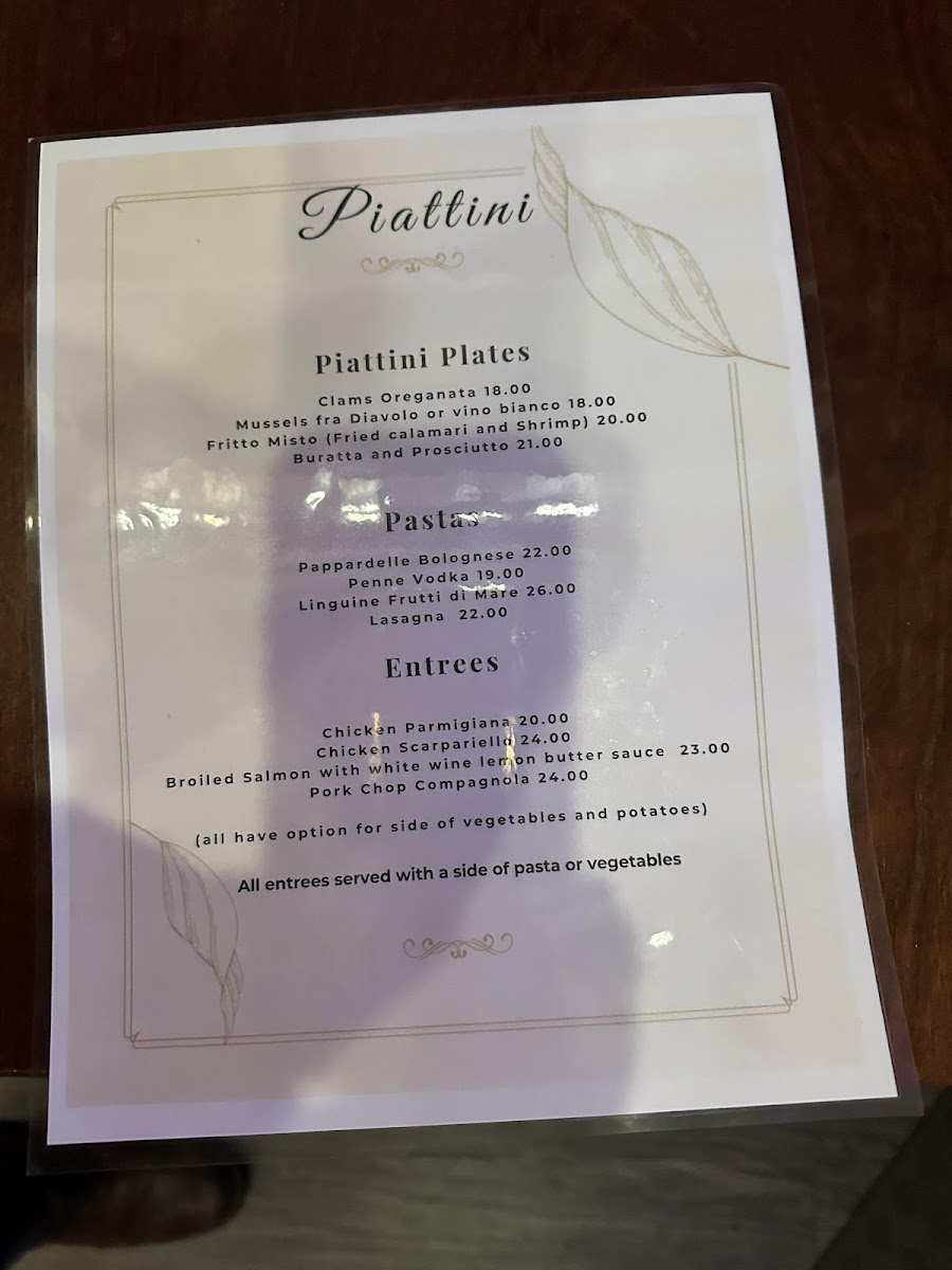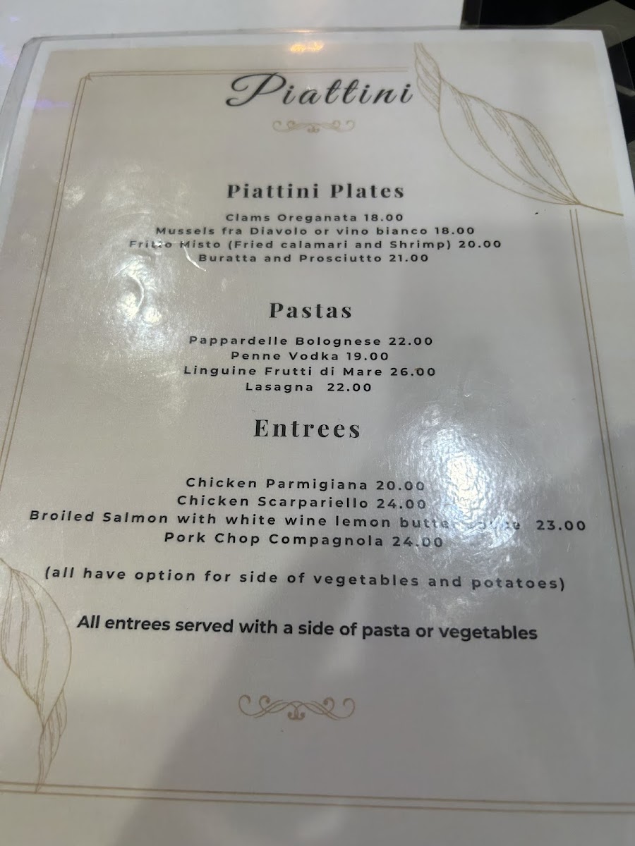 From a reviewer’s perspective, the menu at Piattini Café Bar Osteria feels like a confident summary of Italian comfort food done with balance and intention. The Piattini Plates set the tone with shareable starters such as Clams Oreganata, Mussels Fra Diavolo Or Vino Bianco, Fritzo Misto, and Buratta And Prosciutto, offering a mix of briny seafood, light frying, and classic Italian pairings that invite the table to ease into the meal. The pasta selection continues this traditional approach, with familiar, satisfying choices like Pappardelle Bolognese, Penne Vodka, Linguine Frutti Di Mare, and Lasagna, each representing a different expression of Italian pasta-from rich, slow-cooked meat sauces to seafood-forward preparations and comforting baked layers. Moving into the main courses, the entrees highlight hearty, well-loved dishes including Chicken Parmigiana, Chicken Scarpariello, Broiled Salmon With White Wine Lemon Butter, and Pork Chop Compagnola, giving diners a range of options across poultry, seafood, and meat, all rooted in classic Italian-American flavors. To round out the menu, the Fresh Pastas section keeps things simple and crowd-pleasing with Aifredo and Vodka Sauce, reinforcing the restaurant’s focus on familiarity and consistency rather than overcomplication. Taken as a whole, Piattini Café Bar Osteria’s menu feels cohesive and approachable, favoring timeless recipes and recognizable names that make it easy for guests to find something comforting, satisfying, and true to the Italian trattoria spirit.